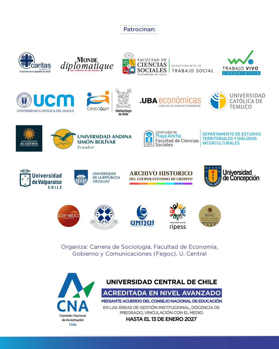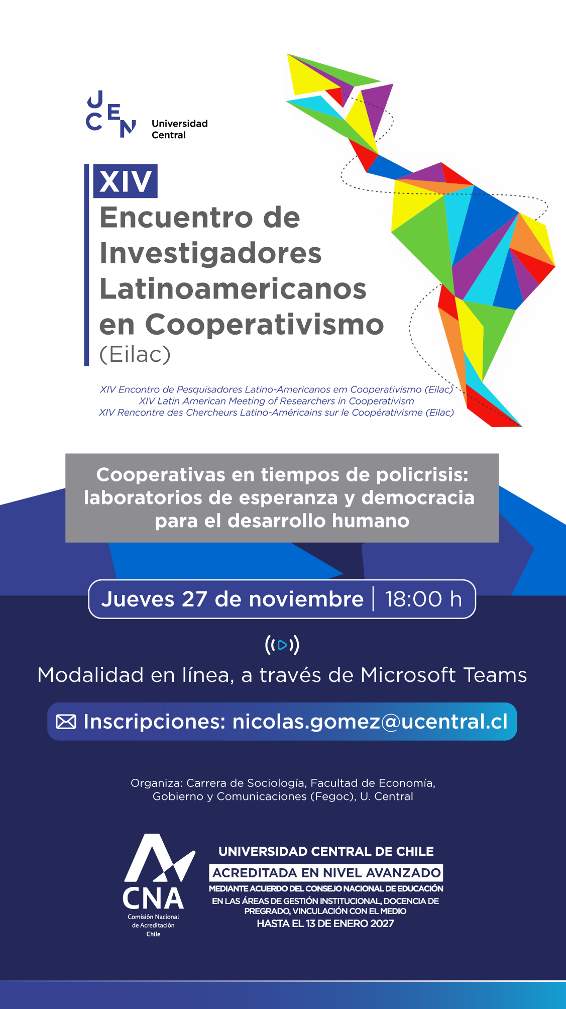 La decimocuarta edición se llevará a cabo los días 3 y 4 de noviembre de 2026 en Santiago de Chile, en la Escuela de Sociología de la Universidad Central de Chile. El EILAC reunirá a diversos actores del mundo académico, social y político, con el propósito de fomentar el intercambio de experiencias y metodologías que fortalezcan la Economía Social y Solidaria (ESS) en América Latina.